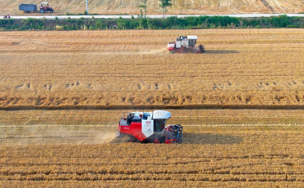 2022年6月8日,在河南省安陽(yáng)市湯陰縣菜園鎮(zhèn)高標(biāo)準(zhǔn)農(nóng)田示范區(qū),收割機(jī)在麥田作業(yè)(無(wú)人機(jī)照片)。新華社記者郝源攝
